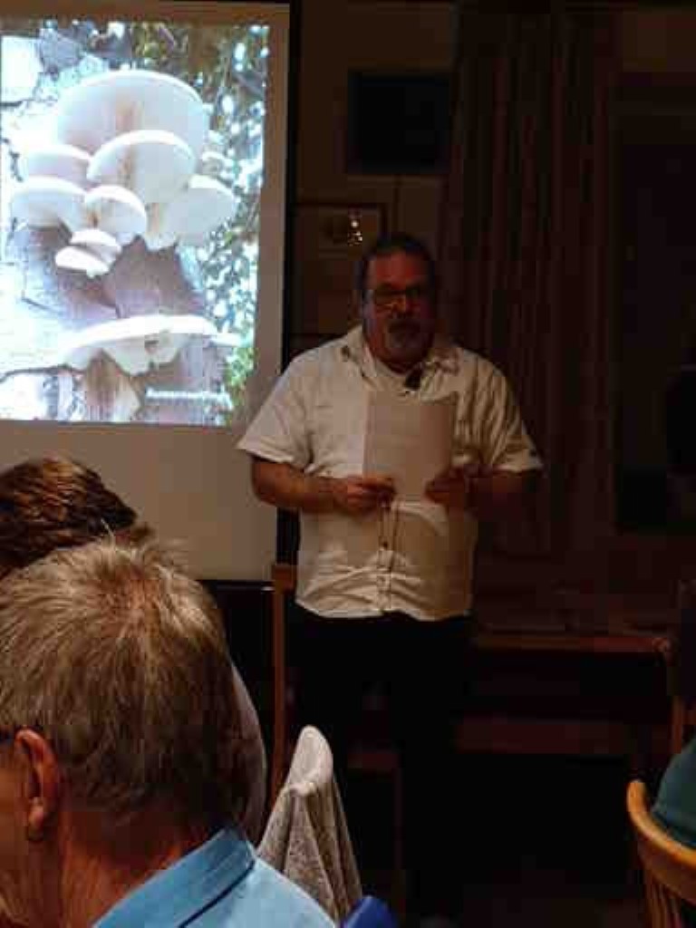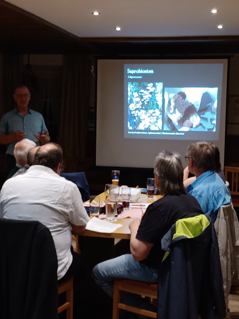 Anschließend referierte Johann Tilp zum Thema “ Pilze selber züchten „. Er stellte die verschiedenen Anbaumethoden vor. Da man verschiedene Unterlagen beimpfen kann, wie Substrat, verschiedene Hölzer, Stroh oder Kaffeesatz, unterscheidet sich auch die Vorgehensweise. Bei Hölzern z. B. die Dübel-Beimpfung, Schnittimpfmethode oder Baumscheibenimpfung. Auch die Zeit bis zur Ernte unterscheidet sich bei den verschiedenen Anbauarten enorm. Bei einigen kann man nach wenigen Wochen bereits ernten, bei anderen nach 6-12 Monaten, dafür oft mehrere Jahre. Bei einigen Arten wird der Stamm in Erde gepflanzt, wenn er fertig durchwachsen ist. Auch der Standort ist entscheidend. Er sollte nicht zu sonnig, zu windig oder zu trocken sein. Auch über die Ernte, Lagerung und die anschließende Verarbeitung konnte man einiges erfahren wie z. B. Trocknen, zu Pilzpulver verarbeiten oder einfrieren. Er stellte einige Bezugsquellen und einschlägige Literatur vor, die hilfreich für den Anbau sind.